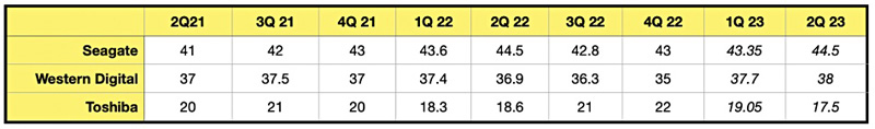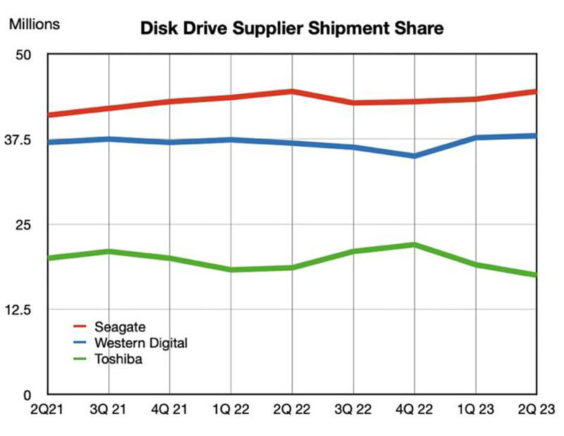 Excluindo as unidades Nearline, cerca de 22 milhões de unidades foram enviadas no segundo trimestre, abaixo das remessas do primeiro trimestre de 22,1 milhões e 17% menos do que as remessas do segundo trimestre do ano passado de 26,2 milhões. Em particular, as unidades de 3,5 polegadas para PCs de mesa e eletrônicos de consumo foram vendidas de 11,5 milhões para 11,9 milhões, ante 11,07 milhões no trimestre anterior e 14,23 milhões no ano anterior. As remessas de discos rígidos de 2,5 polegadas (SFF) totalizaram pouco menos de 9 milhões, significativamente abaixo das remessas no trimestre anterior (9,64 milhões de unidades) e no mesmo trimestre de 2022 (9,97 milhões de unidades).