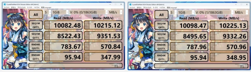 Os testes no CrystalDiskMark confirmaram a capacidade da unidade de fornecer leituras e gravações sequenciais a 10 Gb/s, conforme anunciado pelo fabricante. Observe que esse indicador de velocidade de leitura e gravação é relevante apenas para uma unidade de 2 TB. Os modelos de unidade PCIe Gen5 de menor capacidade do CFD suportam velocidades de leitura e gravação de até 9,5 Gb/s, o que também parece bastante impressionante.