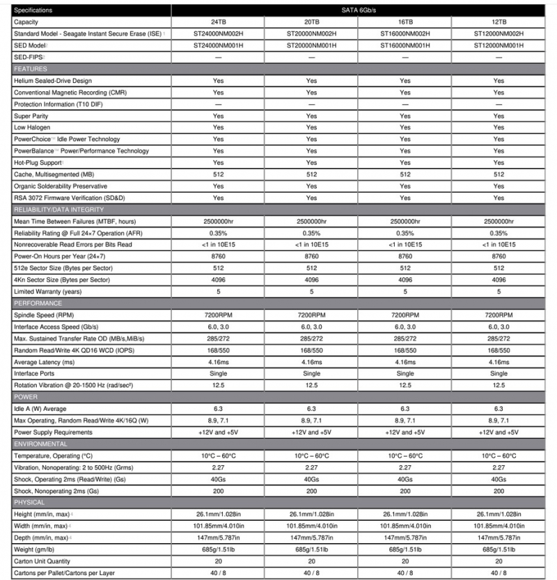 Os novos produtos oferecem suporte aos recursos de criptografia Seagate Secure, fornecendo disco com criptografia automática (SED), SED-FIPS e apagamento seguro instantâneo (ISE). O HDD Exos X24 vem com garantia do fabricante de cinco anos.