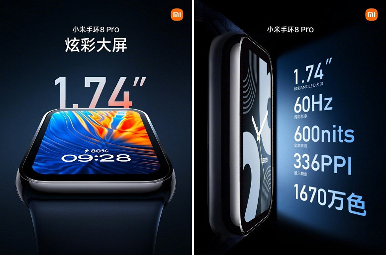 O Smart Band 8 Pro recebeu uma tela AMOLED de 1,74 polegadas maior que o modelo 7 Pro (1,64 polegadas). A resolução da tela cresceu e agora é de 336 × 480 pixels. A densidade de pixels também aumentou ligeiramente – 336 PPI contra 326 PPI do modelo anterior. O brilho aumentou em 100 cd/m2 e agora é de 600 cd/m2. A tela tem taxa de atualização de 60 Hz e é protegida por Gorilla Glass.