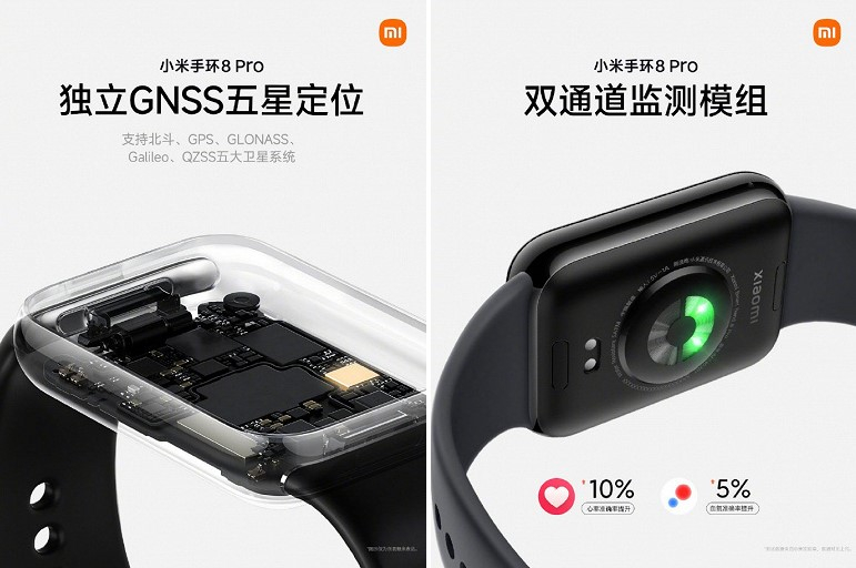 A novidade funcionará com uma única carga de bateria por mais tempo que seu antecessor – a Xiaomi afirma para a Smart Band 8 Pro até 14 dias de funcionamento (12 dias para o modelo 7 Pro). A nova pulseira inteligente recebeu um sensor óptico de canal duplo aprimorado, responsável por determinar a frequência cardíaca e os níveis de saturação de oxigênio no sangue. Há também um chip NFC e um receptor GPS, mais de 150 modos de treinamento são fornecidos.