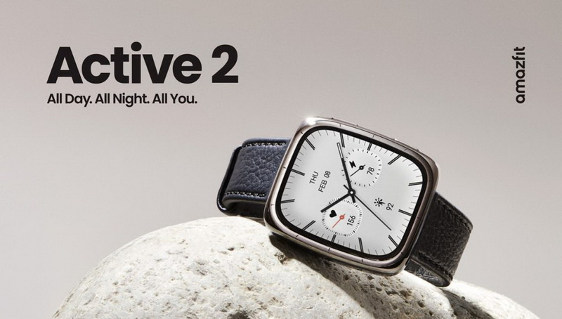 A Amazfit apresentou o smartwatch Active 2 Square. Como o nome sugere, o dispositivo possui uma tela quadrada. Sua diagonal é de 1,75 polegadas, e utiliza uma matriz AMOLED com resolução de 390 × 450 pixels e brilho de até 2000 cd/m². A tela é protegida por vidro safira e o corpo é feito de aço inoxidável polido.