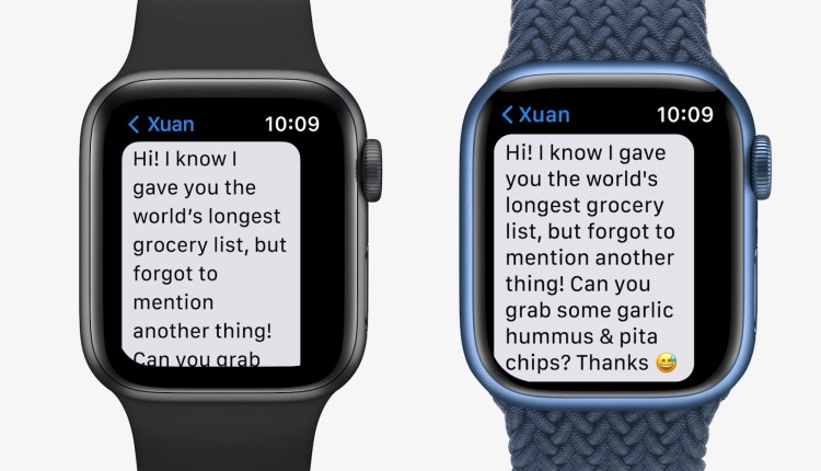 De acordo com os desenvolvedores, os usuários poderão colocar 50% mais texto na tela do novo relógio. Vale ressaltar que a Apple mudou o tamanho da caixa do relógio inteligente apenas pela segunda vez. Anteriormente, isso acontecia em 2018, quando os dispositivos da Série 4. Em geral, os novos relógios não diferem visualmente dos dispositivos da geração anterior, embora antes do lançamento dos relógios inteligentes eles fossem atribuídos a um visual ligeiramente diferente.