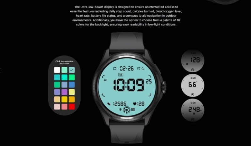 O fabricante está apresentando a tela do novo smartwatch como uma “tela de consumo de energia ultrabaixa”, projetada para fornecer acesso ininterrupto às funções do dispositivo, incluindo pedômetro, queima de calorias, níveis de oxigênio no sangue e frequência cardíaca. Suporta 18 opções de cores de luz de fundo da tela para interação conveniente com gadgets em condições de pouca luz.