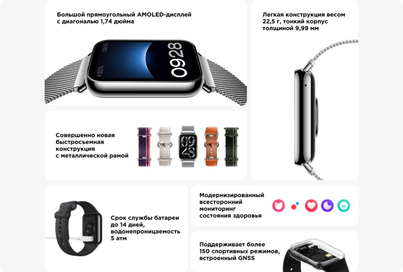 O dispositivo vestível suporta mais de 150 modalidades esportivas, desde corrida e natação até ioga e dança, informando o usuário sobre o andamento do treinamento, por exemplo, ao correr – sobre a distância, velocidade e duração da corrida, frequência cardíaca, etc. Também pode ser usado para medir o nível de atividade física durante 7 dias em uma escala de 100 pontos. Graças à sua resistência à água de 5 ATM, você pode levar a pulseira de fitness para treinos ao ar livre em qualquer clima, bem como para aulas de natação.