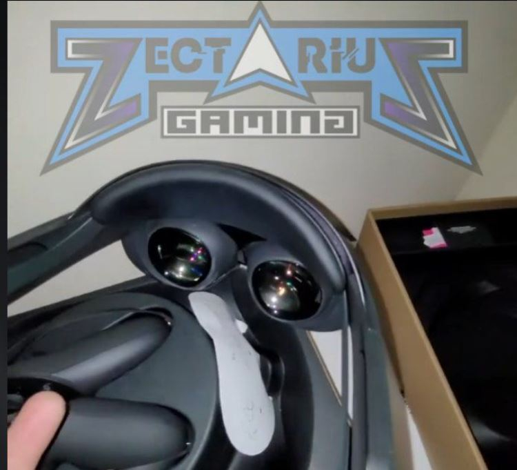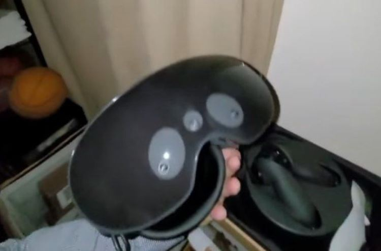O autor do vídeo retira o fone de ouvido e o controle pretos da caixa. Três câmeras são colocadas no painel frontal do dispositivo e o controlador parece um pouco diferente em comparação com a aparência de seus antecessores.