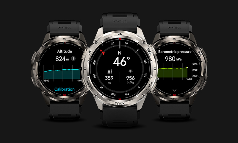 O suporte à navegação GPS permite rastrear sua localização e traçar uma rota, e uma bússola integrada determina a direção do movimento. Assim como os dispositivos Garmin, o smartwatch possui um modo “Andar em marcha ré”, permitindo que você retorne ao ponto de partida pela mesma rota. Além disso, o smartwatch Tank T3 Ultra 2 é equipado com um altímetro barométrico para determinar a altitude e a pressão atmosférica em tempo real.
