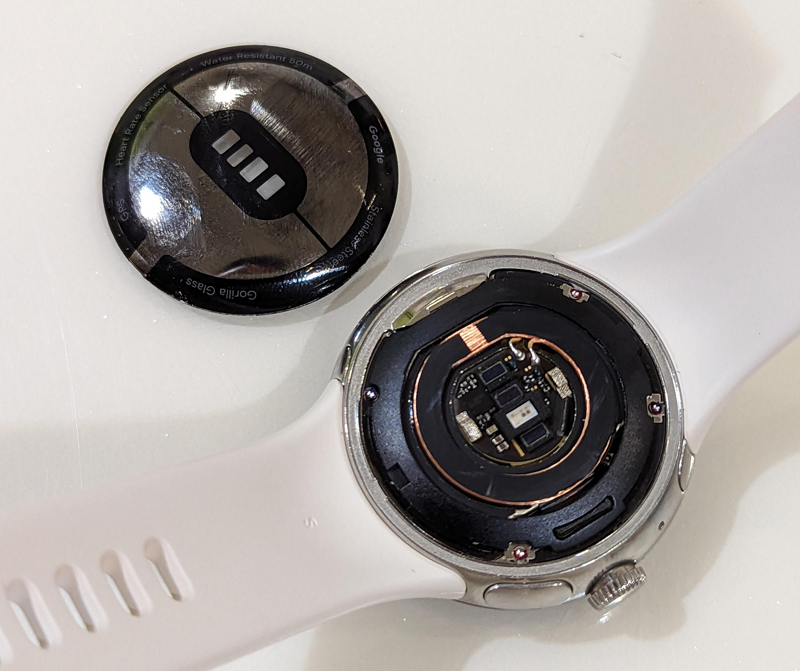 Ao desmontar o Pixel Watch, o iFixit notou que o adesivo era uma “junta líquida”. O relatório do iFixit diz: “O vidro traseiro parece ser mantido no lugar por algum tipo de junta líquida que veda firmemente. Também descasca o vidro com pouco ou nenhum resíduo”.