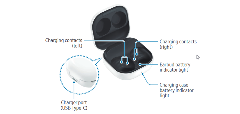 O manual do usuário também inclui uma descrição do case usado para carregar e armazenar os fones de ouvido. Também não difere de outros dispositivos similares da empresa e está equipado com uma interface USB Type-C.