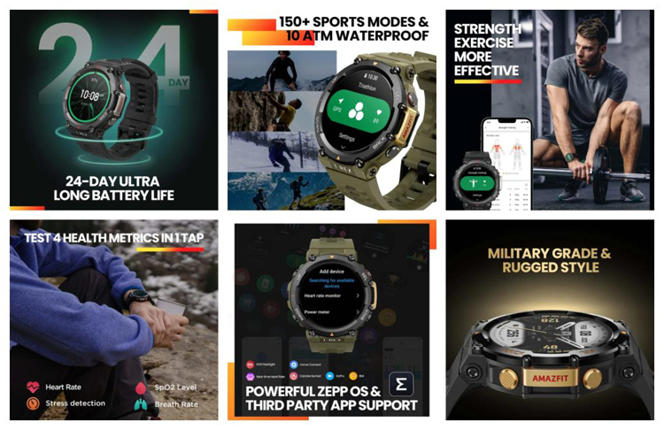 Mais de 150 modos de esportes e fitness estão disponíveis através do Zepp App. Suporta Bluetooth 5.0 sem fio. A novidade é feita de acordo com a especificação MIL-STD-810G. A versão selada de acordo com o padrão 10ATM é mencionada. As dimensões são 47,1 × 47,1 × 13,66 mm, peso – 66,5 g.