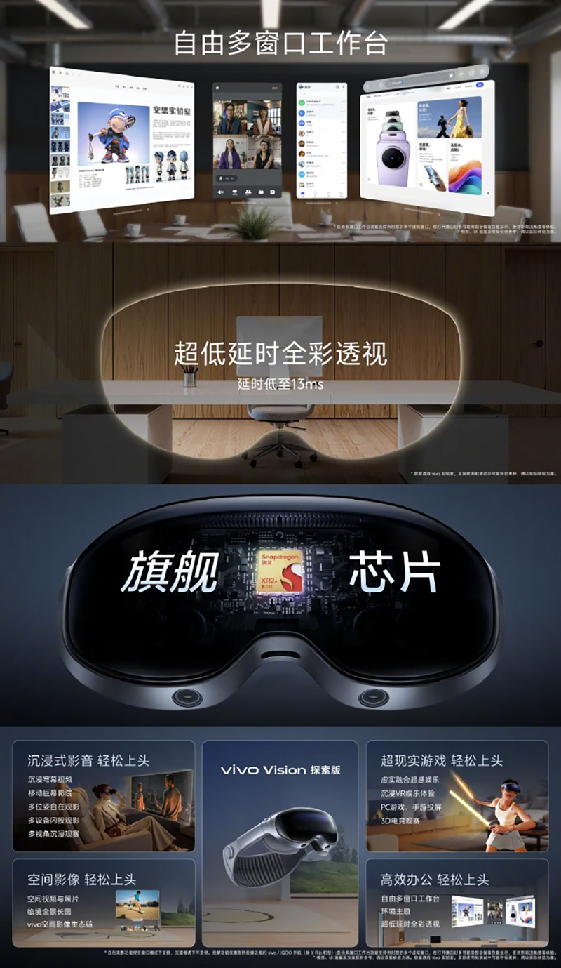 O dispositivo é equipado com um chip Qualcomm Snapdragon XR2+, que, segundo a Vivo, oferece 2,5 vezes o desempenho da geração anterior. Além disso, a interface OriginOS Vision da empresa oferece recursos como visualização imersiva de filmes, replays espaciais de esportes e modo multijanela para maior produtividade.