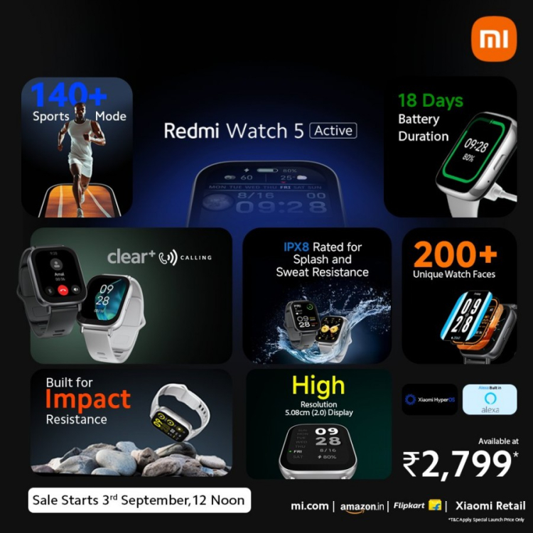 A Xiaomi lançou o smartwatch Redmi Watch 5 Active na Índia. O novo produto suporta chamadas Bluetooth, é equipado com sistema de redução de ruído ativo, possui display IPS de 2 polegadas e pode durar até 18 dias com uma única carga de bateria.