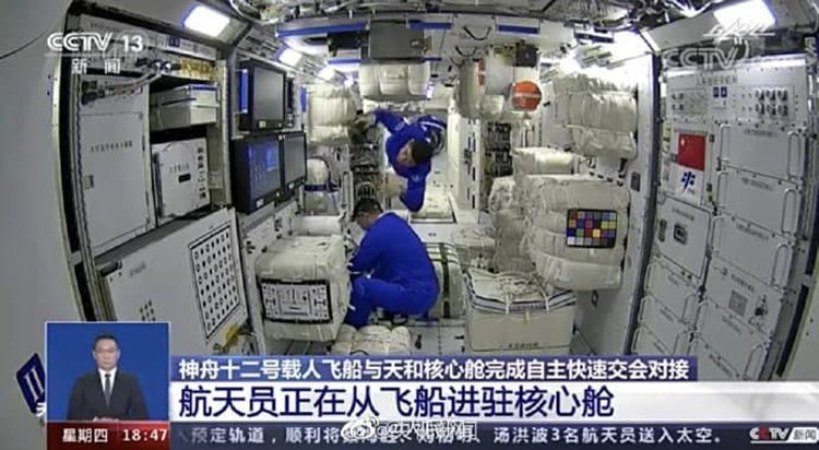 A espaçonave Shenzhou-12 atracou com sucesso em Tianhe, o módulo base da estação orbital chinesa Tiangong em construção. Depois disso, a tripulação de três taikonautas – Nie Haisheng (comandante da tripulação), Liu Bomin e Tang Hongbo – embarcou na estação.