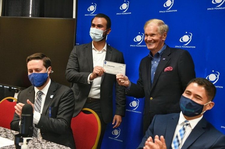 O CEO da NASA, Bill Nelson, entrega um cheque de 10 centavos ao CEO do Lunar Outpost, Justin Cyrus. (Foto: Fundação Espacial)