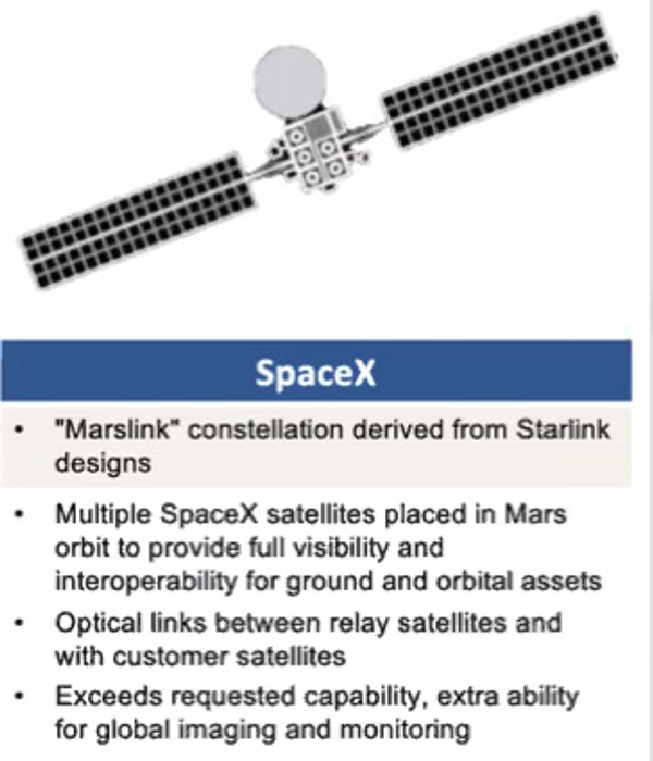 De acordo com a apresentação, a NASA pediu às empresas aeroespaciais que apresentassem propostas para suas tecnologias que poderiam ser usadas em Marte. Um dos slides da apresentação da NASA descreve o conceito da SpaceX para o serviço de Internet Marslink, baseado no projeto dos satélites Starlink.