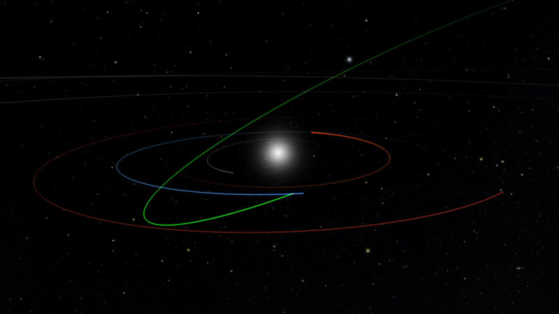A órbita do asteroide 2022 SF289 (linha verde) cruza a da Terra (linha azul). Fonte da imagem: washington.edu