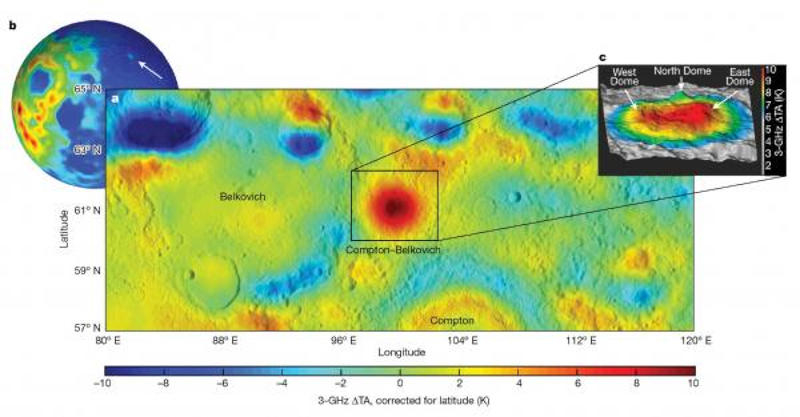 Dispositivos chineses ajudaram a mapear a temperatura abaixo da superfície da lua: a radiometria de microondas permite olhar a uma profundidade de 0,3 a 5,6 m e medir a temperatura das rochas. Entre as crateras Compton e Belkovich, no outro lado da Lua, foi descoberta uma espécie de “ponto quente”, cuja natureza a topografia não conseguia explicar. A única versão plausível acabou sendo uma fonte termal subterrânea.