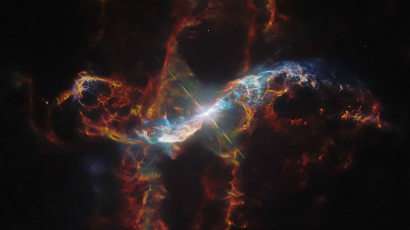 A nova imagem mostra uma espetacular nebulosa em forma de ampulheta formada pela interação de séculos de duas estrelas: uma anã branca compacta e praticamente inalterada (uma estrela quente e queimada) e sua estrela companheira, uma gigante vermelha fria que cresceu até atingir um tamanho maior que o nosso Sol mais de 400 vezes, e mudando sua temperatura e brilho 750 vezes durante um período de aproximadamente 390 dias terrestres.