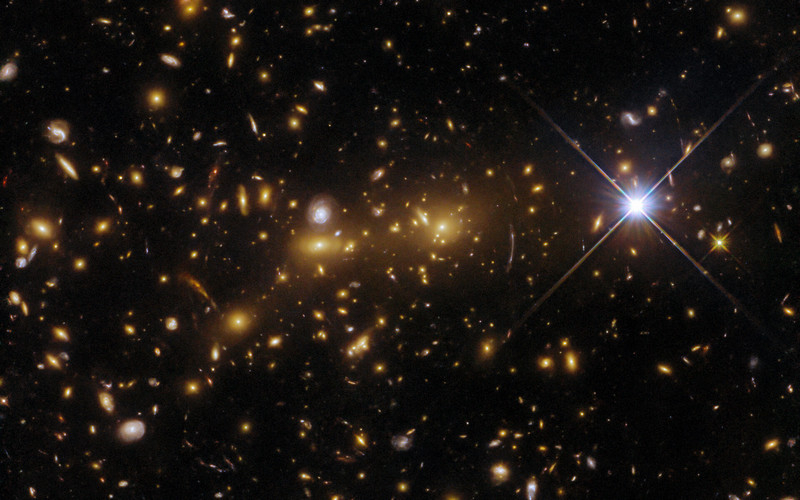 Na nova imagem do Hubble, o aglomerado de galáxias é visível como um denso aglomerado de formas ovais. Cada galáxia tem uma aura laranja brilhante em torno de seu núcleo brilhante. Numerosas outras galáxias estão espalhadas pela imagem, incluindo uma estrela brilhante capturada com quatro feixes de difração característicos.