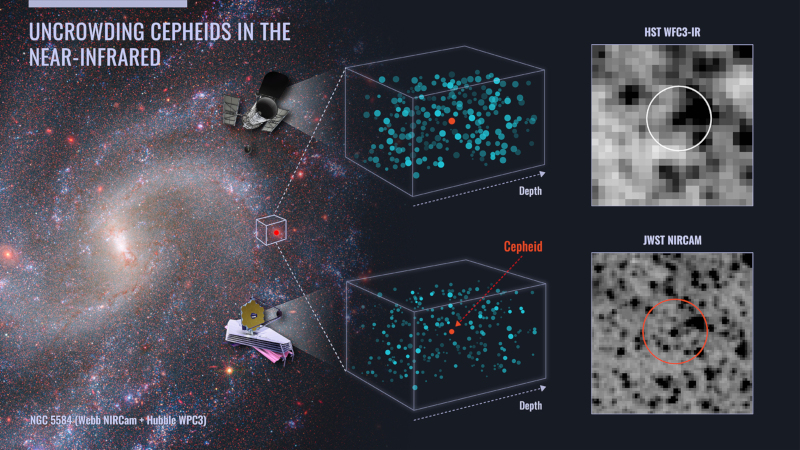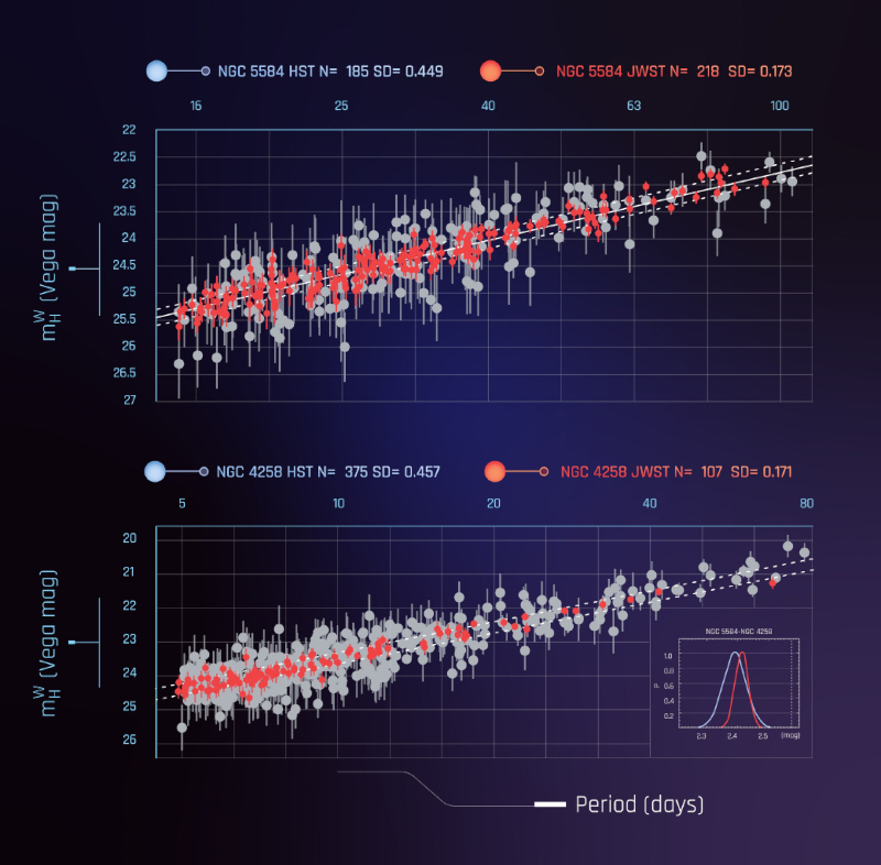 Um grupo de cientistas decidiu determinar a constante de Hubble usando o James Webb. Inicialmente, eles apontaram o telescópio para uma galáxia cuja distância era conhecida para calibrar o telescópio em relação à luminosidade das Cefeidas conhecidas. Depois disso, os cientistas observaram Cefeidas em outras galáxias – um total de 320 objetos. E, apesar do erro natural de medição do Hubble, os seus dados ainda concordavam com as leituras de James Webb. O valor de H0 permaneceu igual a 73 (km/s)/Mpc, o que significa que falhas naturais de projeto ou o fator humano não explicam a tensão do Hubble.