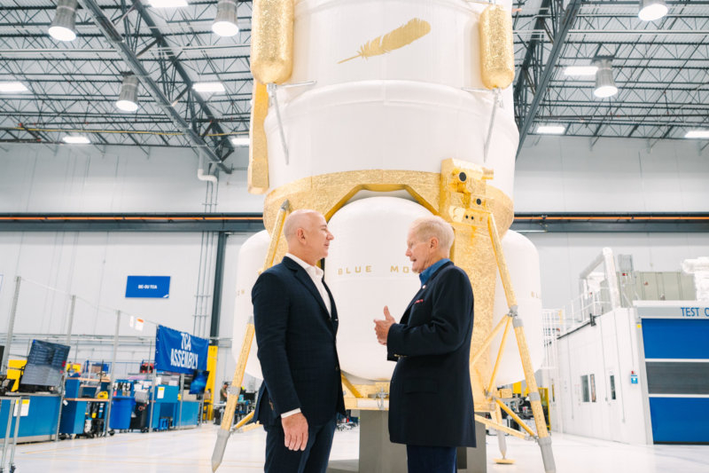 A Blue Origin demonstrou um modelo do módulo de pouso Blue Moon, que deverá estar pronto para voar para a Lua nos próximos três anos. Primeiro, irá para o satélite sem tripulação e, até o final da década, realizará uma missão tripulada.