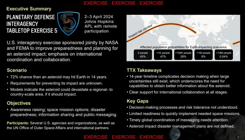 Muitas das unidades internas que participaram nestes exercícios identificaram um grande número de deficiências críticas nas operações da NASA, especialmente em termos de planeamento e comunicações. Por exemplo, o relatório diz que não existe um processo de resposta claramente definido se um asteroide for detectado se aproximando do planeta. Observa-se também que até o momento, apenas um experimento prático foi realizado para evitar que um asteroide colidisse com a Terra. Estamos falando da missão Double Asteroid Redirection Test (DART), na qual a espaçonave de mesmo nome colidiu com o asteroide Demorphos para alterar sua trajetória de vôo.