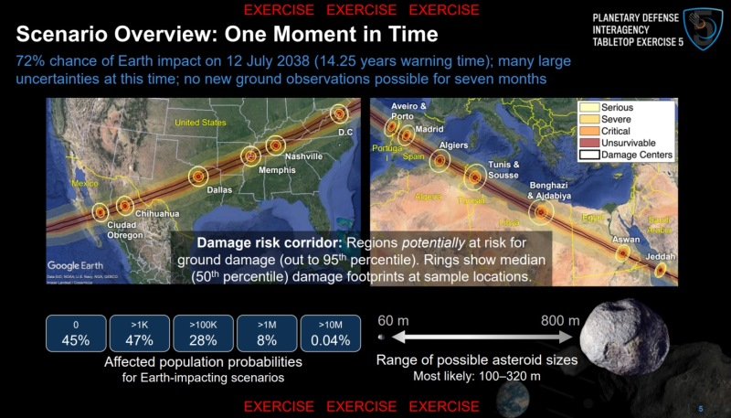 O relatório descreve exercícios internos que a NASA conduziu em um cenário de impacto de asteróide. Este exercício envolveu uma situação em que havia 72% de probabilidade de um impacto de asteroide em 12 de julho de 2038, e os requisitos para evitar o impacto eram desconhecidos. Segundo a lenda, o diâmetro do asteróide é de 60 a 800 metros, mas é mais provável que seu diâmetro seja de 100 a 320 metros. A probabilidade de ninguém ficar ferido na colisão é de 45%, a probabilidade de mais de 1000 pessoas ficarem feridas é de 47%, mais de 100 mil pessoas são 28%, mais de 1 milhão de pessoas são 8%, mais de 10 milhões de pessoas são 0,04%. A área afectada abrange uma vasta área, incluindo os Estados Unidos, México, Portugal, Espanha, Argélia, Tunísia, Líbia, Egipto e Arábia Saudita.