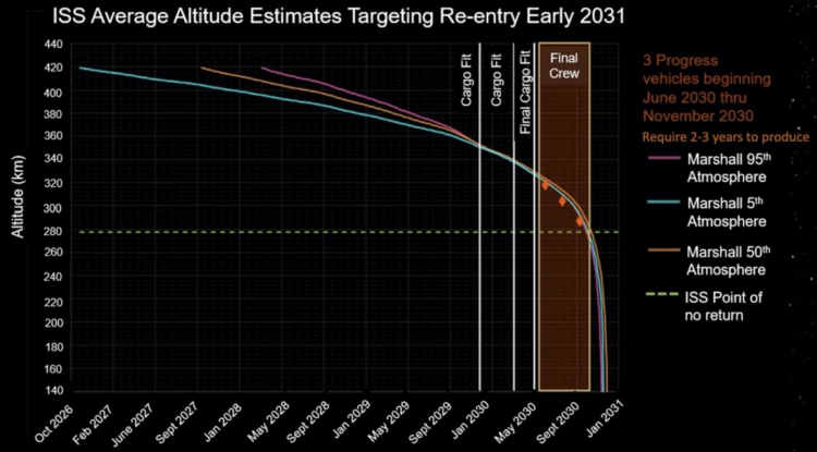 De acordo com um relatório da NASA, a operação de pouso da ISS da órbita baixa da Terra está programada para começar em 31 de janeiro de 2031. A deorbitação da estação deve ser realizada pelos sistemas de propulsão da própria ISS, bem como pelos motores dos navios a ela ligados. A NASA calculou que isso exigiria três caminhões espaciais russos Progress. Além disso, eles podem usar as forças da espaçonave Northrop Grumman Cygnus.