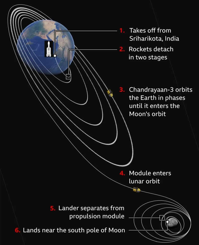A ISRO disse no domingo que a sonda Vikram foi lançada com sucesso em órbita lunar baixa, com um pouso planejado após o nascer do sol lunar. Se a missão Chandrayaan 3 for bem-sucedida, a Índia será a primeira a pousar no pólo sul da lua. Além disso, a Índia se tornará o quarto país a fazer um pouso suave na lua, depois dos EUA, da URSS e da China.