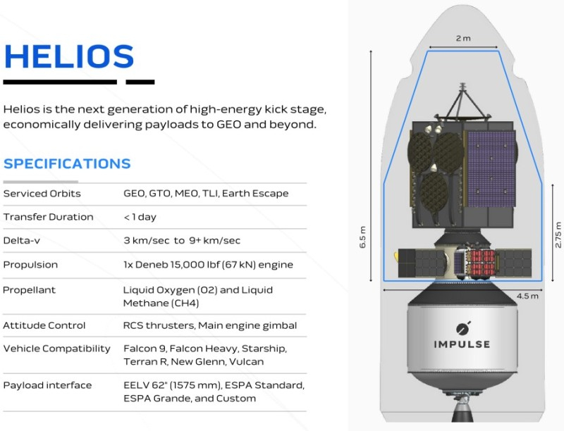 A Impulse Space agora está produzindo componentes do motor Deneb, que devem começar os testes em março. A empresa planeja então começar a testar o conjunto completo do motor. A espaçonave Helios está programada para estrear em 2026. Talvez a essa altura não seja o único dispositivo desse tipo – a Blue Origin anunciou planos para criar uma espaçonave Blue Ring com carga útil de até 3 toneladas.