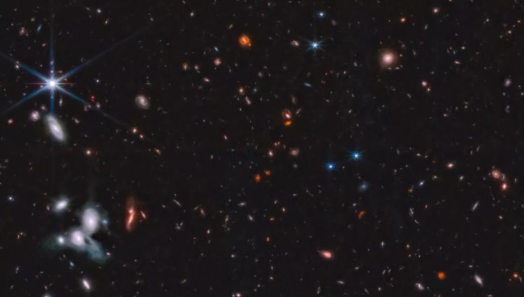 Esta semana, os cientistas divulgaram uma imagem compilada a partir de imagens tiradas pelo Telescópio Espacial James Webb da Administração Nacional de Aeronáutica e Espaço dos EUA (NASA). Esta imagem foi criada pelo Cosmic Evolution Early Release Science Survey (CEERS) a partir de 690 imagens individuais tiradas pela câmera de infravermelho próximo NIRCam.