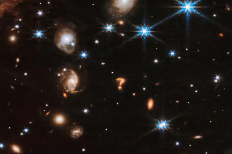Os cientistas tendem a acreditar que este objeto pode ser um par de galáxias em processo de fusão, e eles parecem um ponto de interrogação apenas do ponto de vista de “James Webb”. Funcionários do Space Telescope Science Institute tendem a acreditar que uma das galáxias pode mudar de forma no processo de interação com outra. Talvez esta seja a primeira vez que este objeto foi fotografado, e observações adicionais serão necessárias para fazer afirmações sobre sua natureza com alguma certeza.