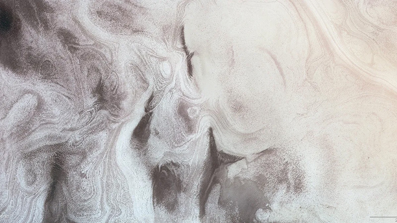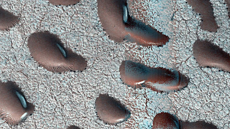 O que parece ser um lindo e pastoral país das maravilhas do inverno nessas imagens, na verdade reflete o processo dinâmico em que a luz solar aquece o gelo de dióxido de carbono e ele muda de sólido para gasoso. À medida que esse processo ocorre, bolsões de dióxido de carbono se formam dentro do gelo.