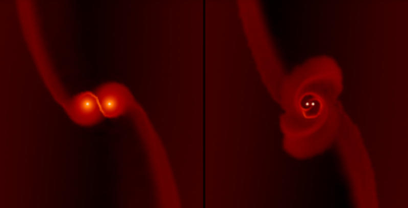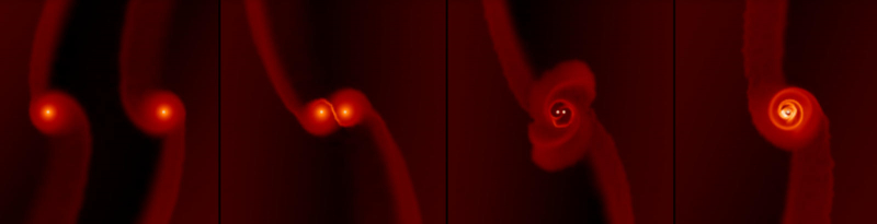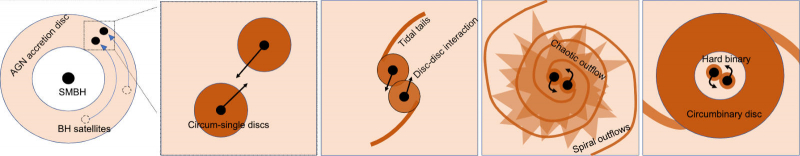 A simulação mostrou que os buracos negros de massa estelar podem ser puxados para os discos de acreção de suas contrapartes supermassivas, onde se combinam em sistemas binários com sua própria espécie. O gás e a poeira nesses discos diminuem a velocidade de pequenos buracos negros – eles não se separam, mas estão ligados gravitacionalmente uns aos outros. Ao fazer isso, cada um forma seu próprio disco de acreção, uma versão menor do que envolve o objeto supermassivo. Fusões de buracos negros de massa estelar também geram fortes explosões de gás. Descobriu-se também que, em metade desses sistemas, pequenos buracos negros giram em torno do supermassivo na direção oposta à sua própria rotação – o chamado movimento retrógrado.