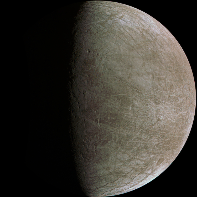 Um fragmento da imagem publicada pela NASA mostra uma seção da superfície de Europa ao norte do equador. Devido ao alto contraste ao longo da linha do terminador (a borda do lado noturno), o terreno irregular é claramente visível, incluindo uma depressão alongada perto da borda da sombra – pode ter sido uma cratera. Os novos dados da Juno sobre a geologia de Europa serão úteis para futuras missões, incluindo a missão Europa Clipper, que será lançada em 2024 para estudar a atmosfera, a superfície e o interior da lua de Júpiter e responder à questão de saber se pode haver vida lá.