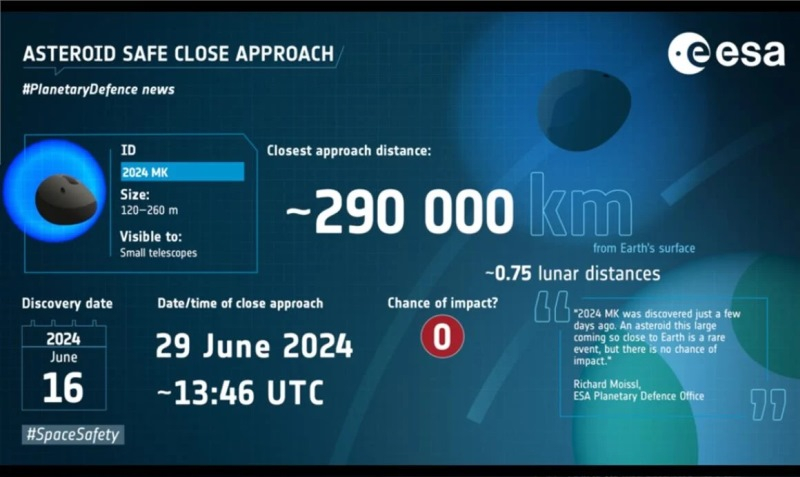 «Não há risco de o 2024 MK colidir com a Terra. No entanto, se um asteroide deste tamanho impactasse, causaria danos significativos, por isso a sua deteção poucos dias antes de passar pelo nosso planeta sublinha a necessidade de melhorar continuamente a nossa capacidade de detetar e monitorizar objetos próximos da Terra potencialmente perigosos.” em uma mensagem da ESA.