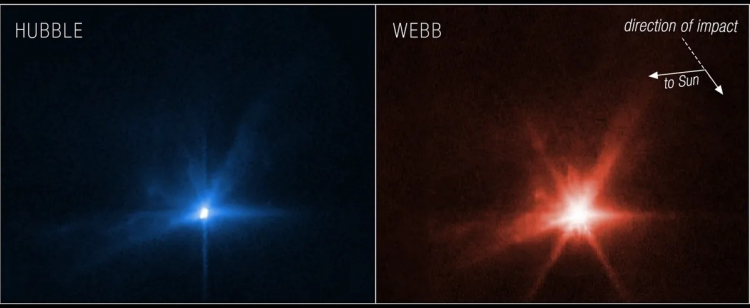 As imagens capturaram luz em diferentes comprimentos de onda – o Hubble estava fotografando a parte visível do espectro e James Webb estava usando instrumentos infravermelhos. No epicentro da explosão, um aumento do nível de brilho persistiu por várias horas. As plumas de matéria ejetadas da superfície do asteroide como resultado do impacto também são visíveis.