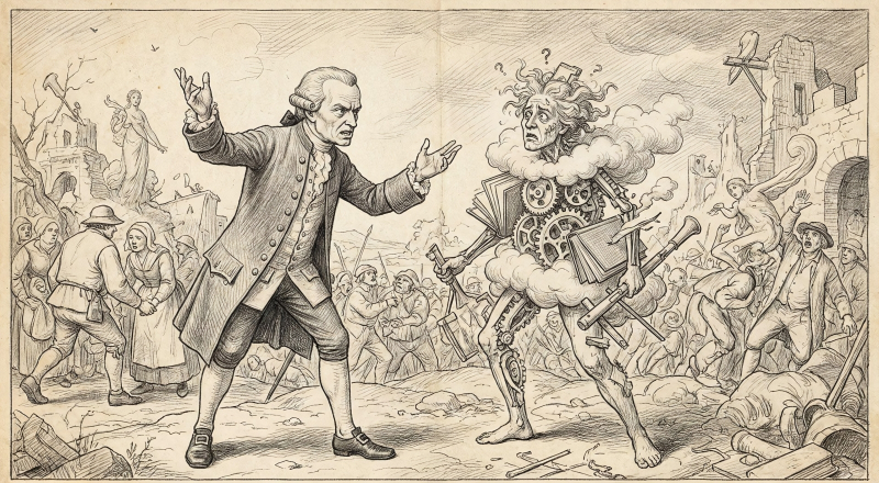 Immanuel Kant, um súdito leal de Sua Majestade Imperial Elizabeth Petrovna, critica a Razão Pura perante uma grande assembleia de pessoas seriamente interessadas; desenho de Pieter Bruegel, o Velho (fonte: geração de IA baseada no modelo Nano Banana).