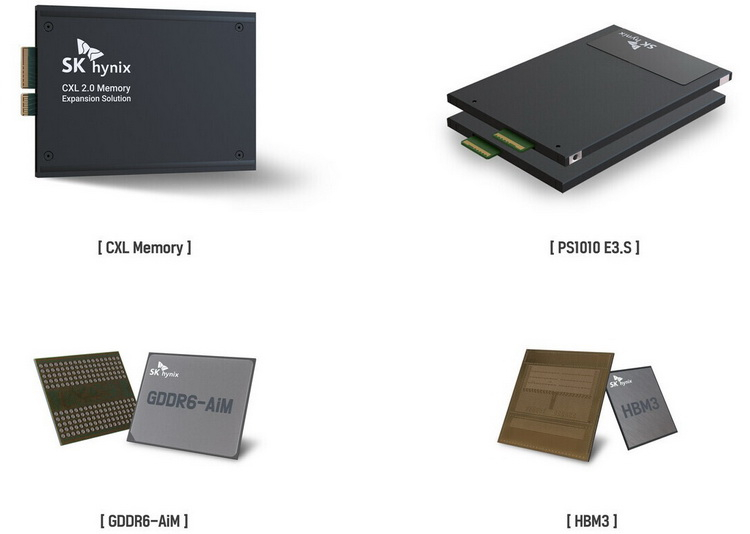 Um dos novos produtos será a memória de vídeo GDDR6-AiM, que utiliza a tecnologia Processing in Memory. A nova memória tem velocidade de 16 Gb/s por pino e opera a 1,25 V. A alta eficiência energética da memória permite redução de até 80% no consumo de energia das operações de transferência de dados da CPU para a GPU. A memória do novo padrão é projetada para aceleradores que trabalham com IA e grandes quantidades de dados. Como parte de sua apresentação, o fabricante também mostrará chips de memória HBM3 de alto desempenho de design próprio e uma unidade de estado sólido com o protocolo CXL 2.0.