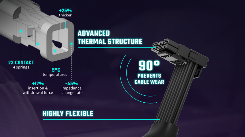 Os novos cabos 12VHPWR da Cooler Master têm pinos 25% mais grossos do que os conectores 12VHPWR padrão e têm quatro pontos de contato com mola em vez de dois. A Cooler Master afirma que seu conector fornece 5 graus de redução de temperatura em comparação com um conector padrão, requer 12% mais força de liberação e oferece 45% menos resistência de contato.