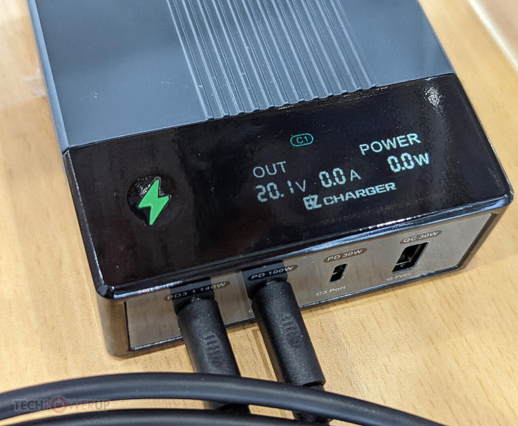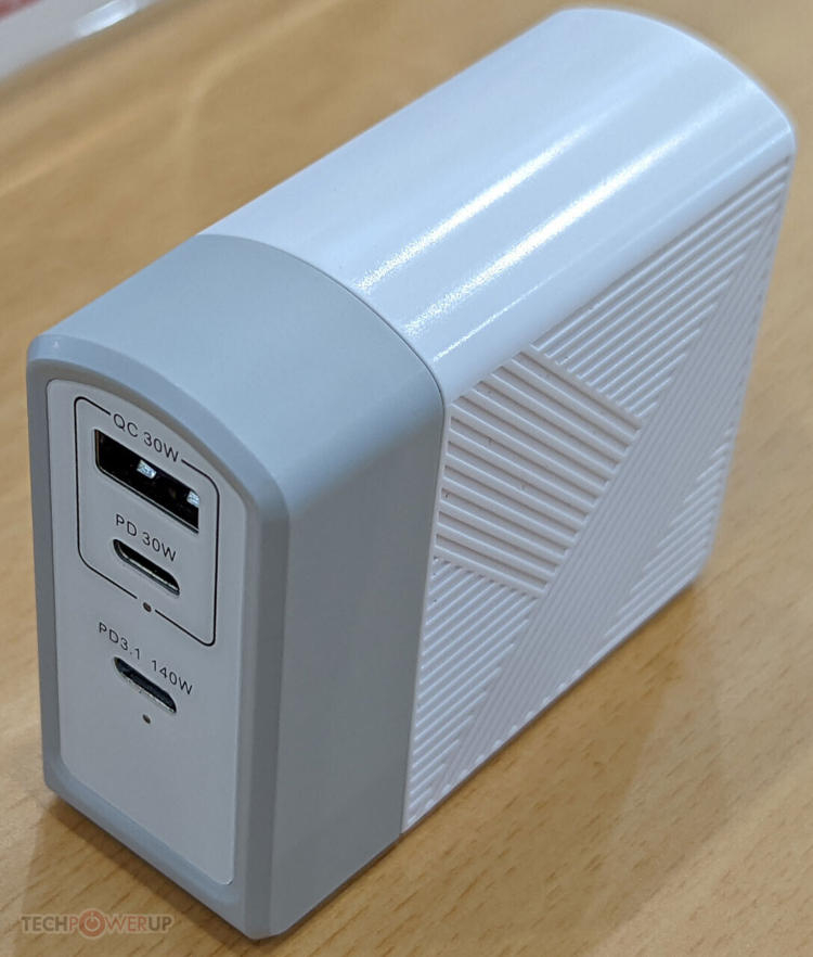 Finalmente, vale a pena notar a terceira amostra de exposição – um carregador compacto com potência de 140 W (28 V, 5 A), que será conveniente para levar com você na estrada. É improvável que algum desses carregadores esteja no varejo em um futuro próximo, mas em um futuro um pouco mais distante, com a disseminação da tecnologia GaN, o número dessas ofertas certamente crescerá.