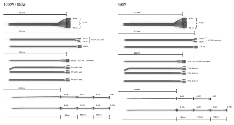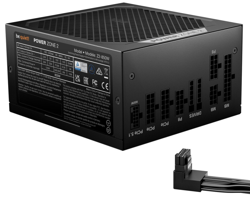 As unidades de fonte de alimentação da zona de potência correspondem às especificações do padrão de potência ATX 3.1 e estão equipadas com um conector nativo de 12V-2 × 6 capaz de até 600 watts para o padrão PCIE 5.1. Além disso, o PSU oferece três conectores PCIE 6+2. O cabo 12V-2 × 6 é equipado com um conector com um ângulo de 90 ° em uma extremidade para uma colocação de cabo mais conveniente e arrumado.