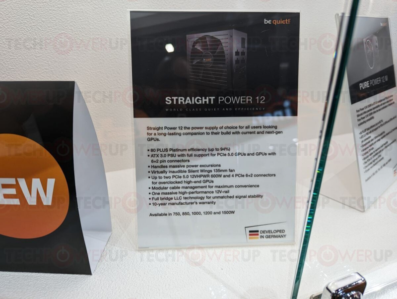 Fique quieto! também trouxe para a feira uma nova série de fontes de alimentação Straight Power 12. Todos os modelos desta série atendem ao padrão ATX 3.0 e possuem certificação 80 Plus Platinum. Sua eficiência sob carga é superior a 94%.