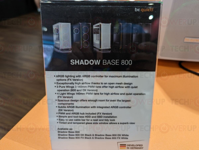 O primeiro modelo da nova série foi o gabinete Shadow Base 800, que estará disponível em três versões – padrão, DX e FX. A variante padrão é uma caixa de tamanho normal sem iluminação RGB. O modelo DX está equipado com uma faixa RGB. Por sua vez, o modelo FX é ricamente decorado com iluminação RGB em todo o espaço.