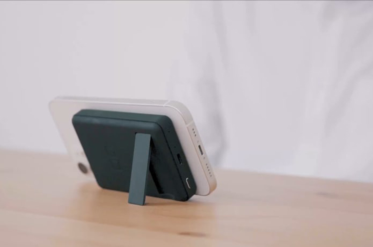 Outra característica da bateria híbrida sem fio é o pequeno suporte dobrável. Ele permite que você posicione seu smartphone em um ângulo conveniente durante o carregamento, por exemplo, para assistir a vídeos ou receitas.