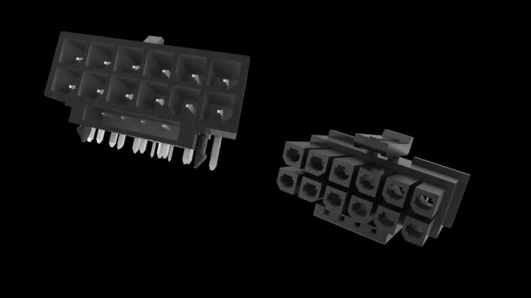 De acordo com os desenhos, o 12VHPWR não atende ao padrão Molex MicroFit. Os contatos de alimentação são espaçados de 3 mm, enquanto os conectores de 6 e 8 pinos existentes têm uma distância de 4,2 mm. Sua largura é de 18,85 mm, portanto não pode ser chamada de miniatura, embora ocupe claramente menos espaço do que três conectores de alimentação PCIe de 8 pinos. No entanto, ele ainda tem seu próprio conector de 12 pinos da NVIDIA, que tem 19 mm de largura.