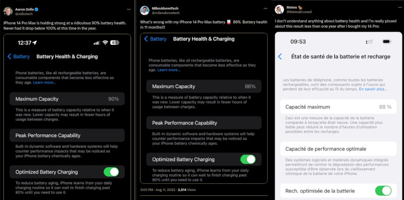 Todos os iPhones usam baterias de íon-lítio, que envelhecem com o tempo. A Apple afirma que as baterias do iPhone são projetadas para manter até 80% de sua capacidade original após 500 ciclos de carga completa. No entanto, relatórios recentes de usuários do iPhone 14 Pro mostram uma queda significativa nesse número. Alguns usuários relataram em suas contas X que a capacidade da bateria diminuiu em até 86-90% em menos de um ano de uso do smartphone.