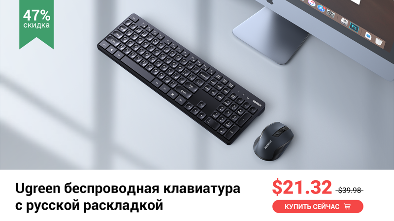 O teclado sem fio Ugreen KU004 com mouse no kit possui layout em russo, inglês e coreano. Graças ao uso de teclas de membrana, o teclado funciona quase silenciosamente.