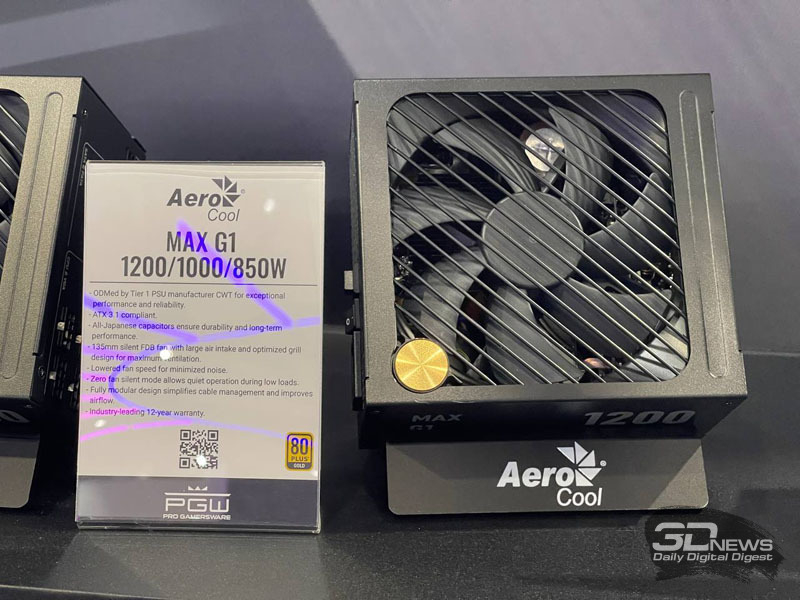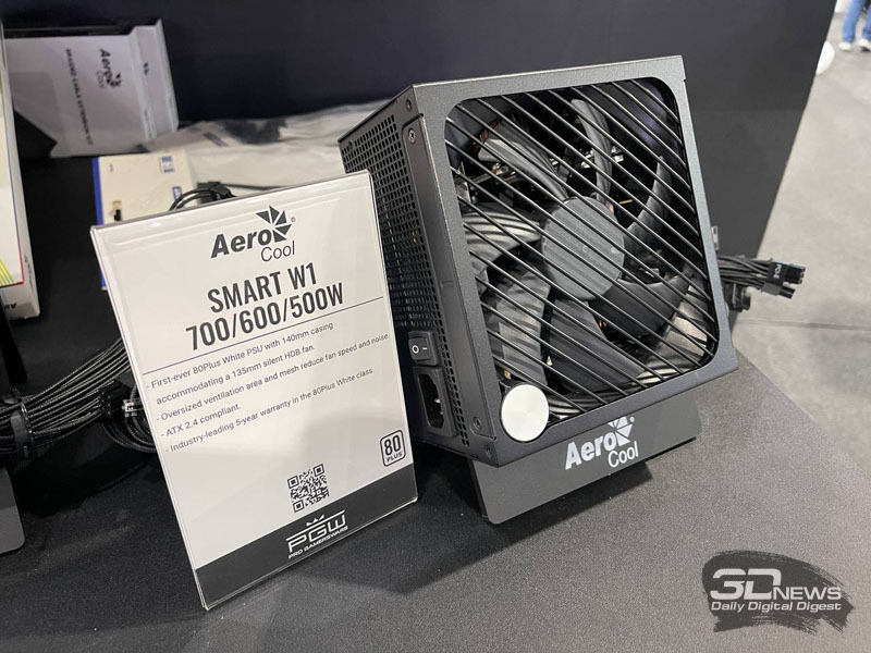 Novas fontes de alimentação também estão em exposição no estande da AeroCool. A família de fontes de alimentação AeroCool SMART inclui os modelos SMART W1 700/600/500W, SMART B1 750/650/550W e SMART G1 750/650/550W com certificados de eficiência 80 Plus White, Bronze e Gold, respectivamente. As fontes de alimentação possuem gabinetes de 140 mm de profundidade e uma ventoinha HDB de 135 mm.