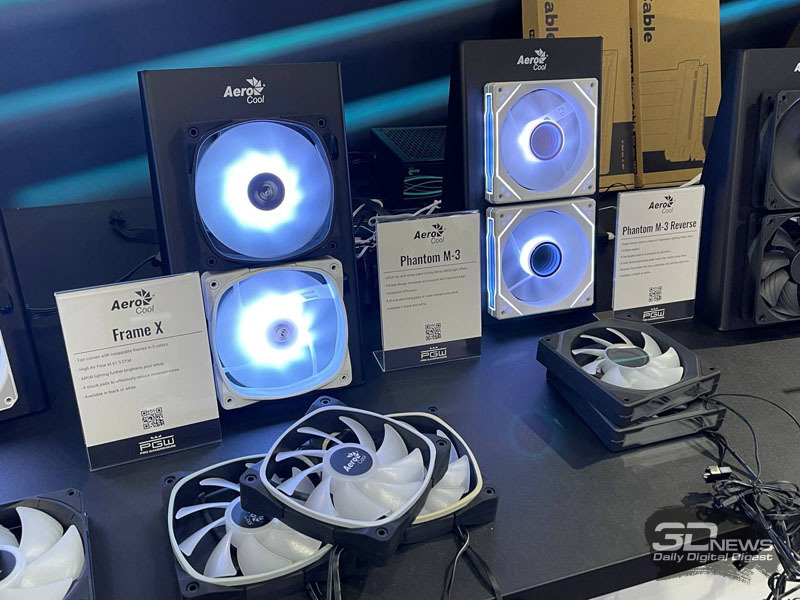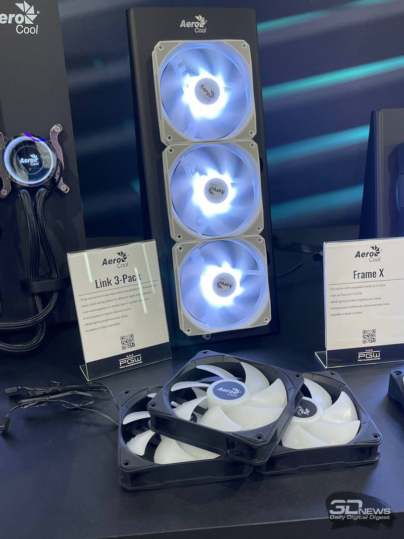 A ventoinha do gabinete AeroCool Frame X para PC está disponível com molduras intercambiáveis em cinco cores, enquanto a ventoinha AeroCool Phantom M-3 está equipada com iluminação LED. Também em exibição no estande da AeroCool estão a ventoinha Phantom M-3 Reverse e os conectores de encaixe Link-3 Pack, facilitando a instalação e remoção das ventoinhas.